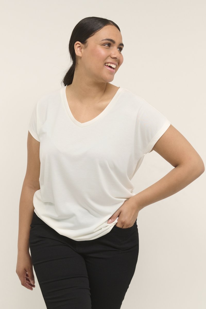 T-shirtDisponibile nelle taglie S–XLDel marchio Kaffe CurveMateriale: 70 % modal, 30 % poliestereVestibilità comodaColore biancoFare clic qui per visualizzare la guida alle taglie