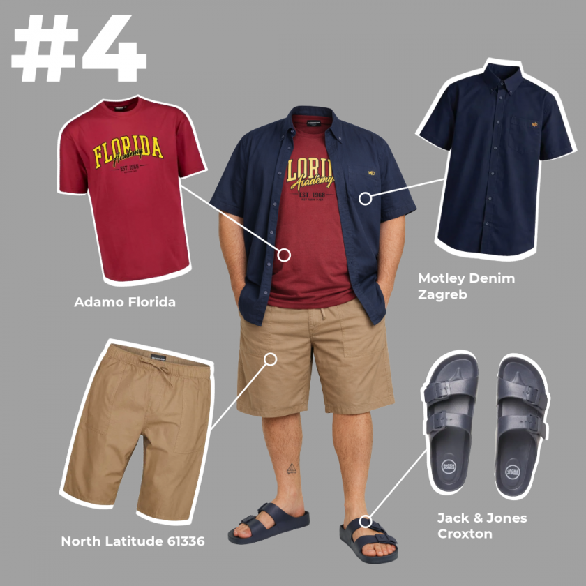 Un outfit semplice per le giornate più calde. La camicia aperta davanti è elegante e ariosa, i pantaloncini mantengono il look rilassato e i sandali sono perfetti per le giornate di sole.